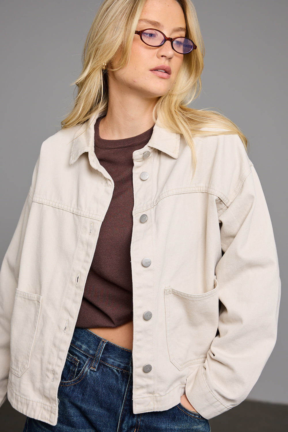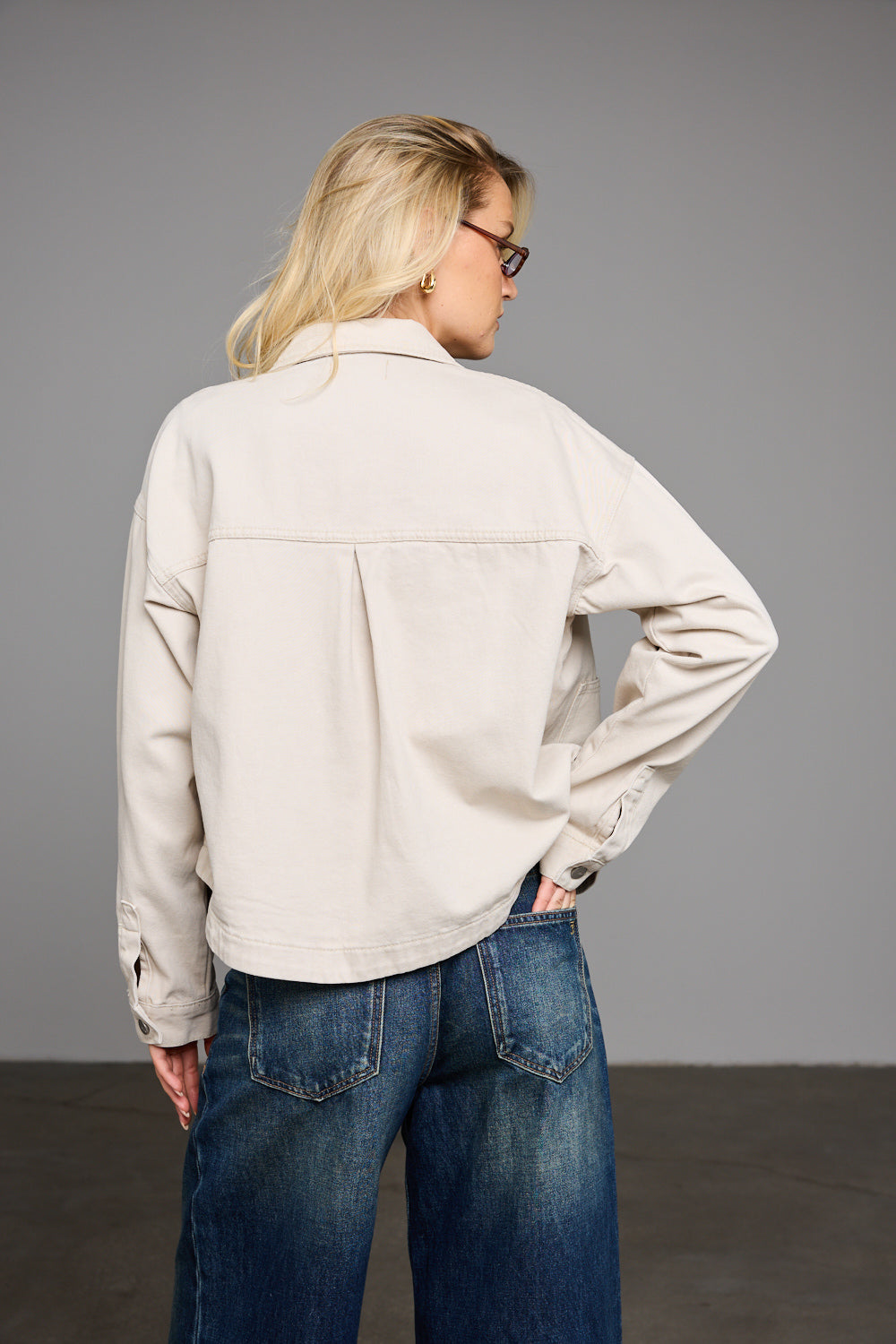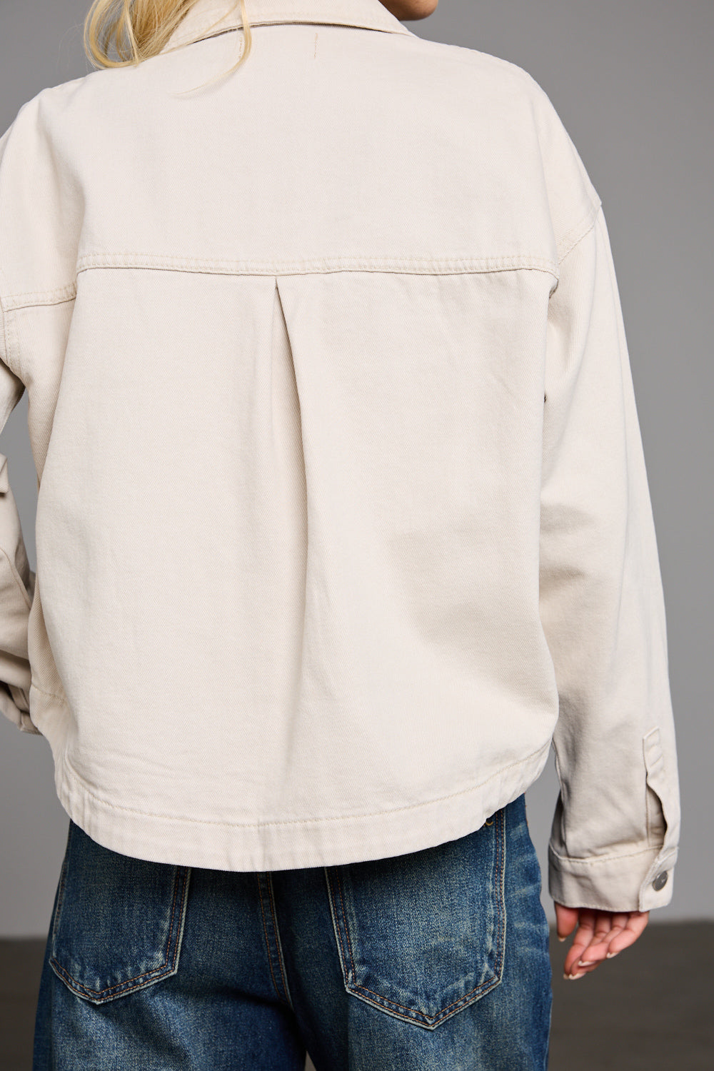 ג'קט ג'ינס בגזרת אוברסייז בשילוב צווארון קלאסי, תפרים בולטים לרוחב, צמד כיסים וסגירת כפתורי תיק תק מלפנים