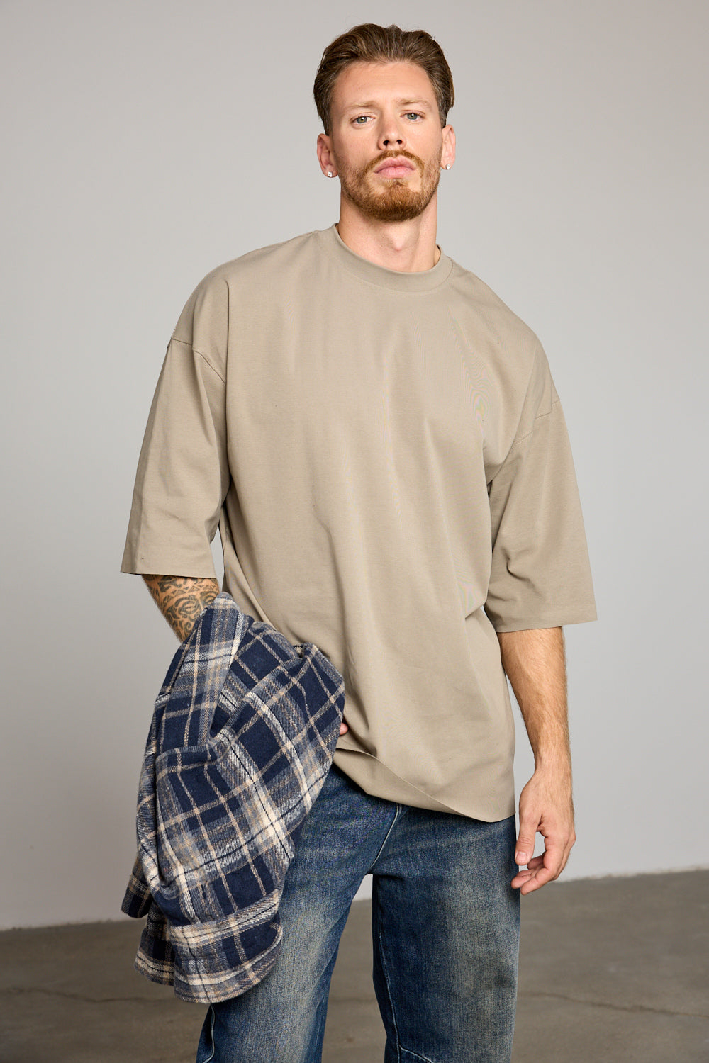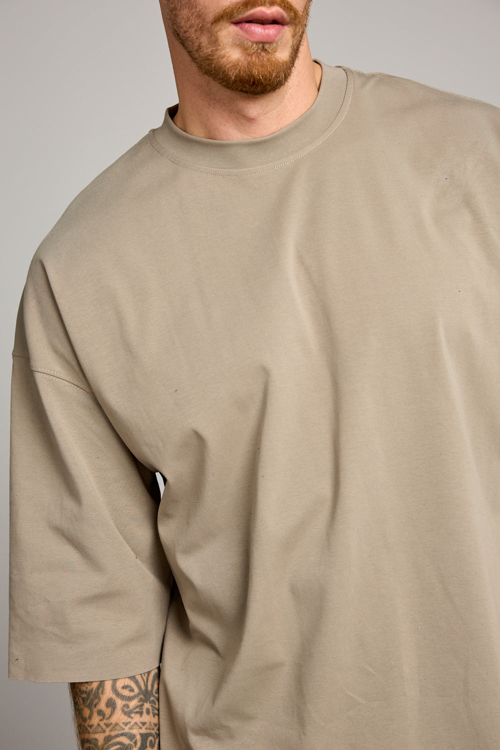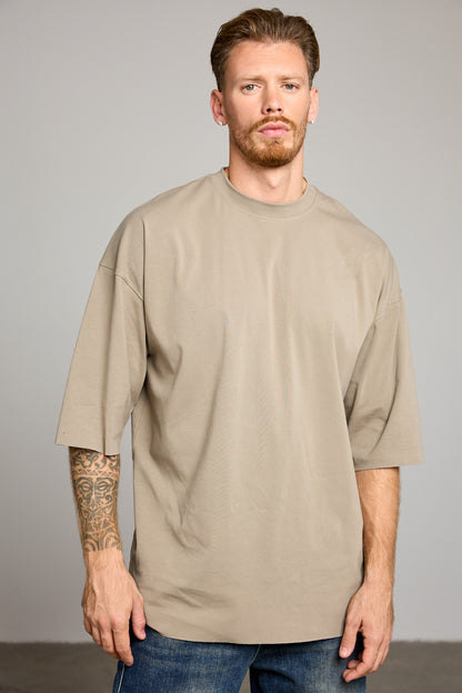 חולצת בייסיק בגזרת אוברסייז מבד נעים ורך למגע בשילוב צווארון מעוגל, שרוולים באורך בינוני וסיומת גזורה