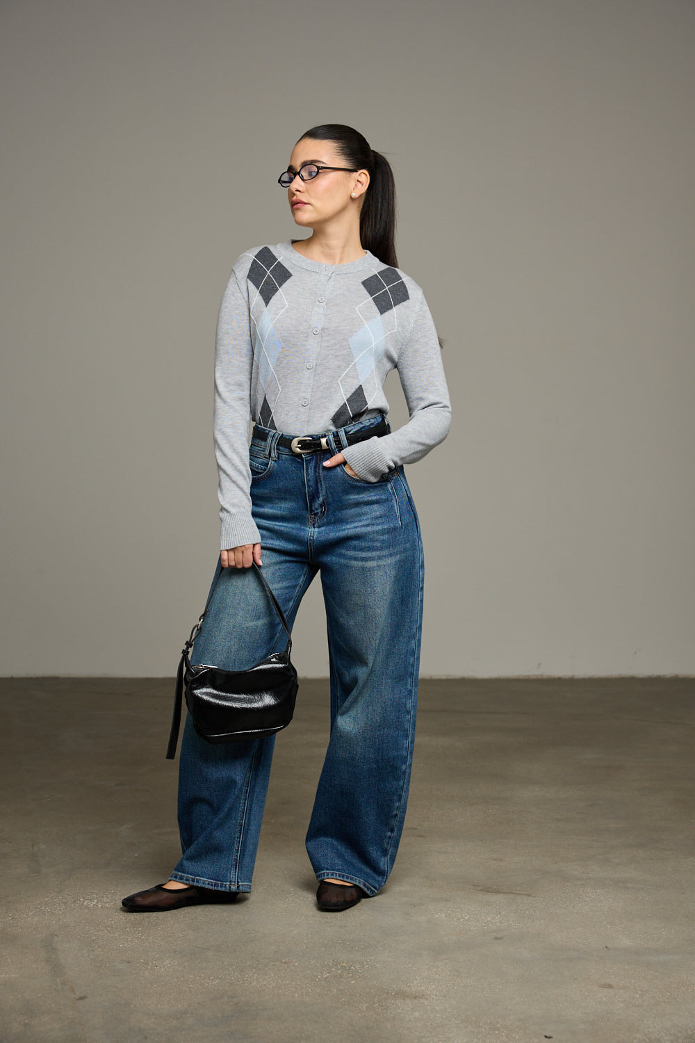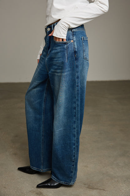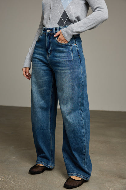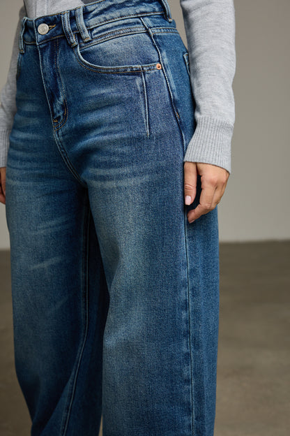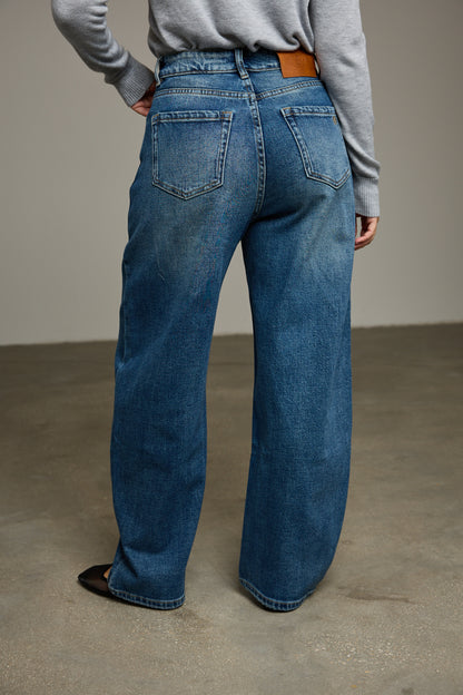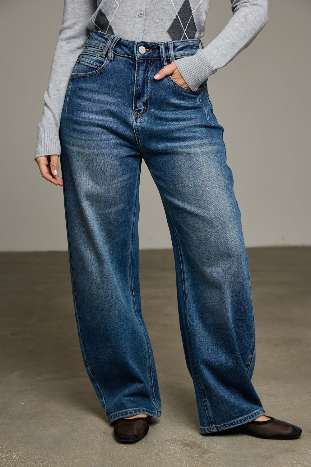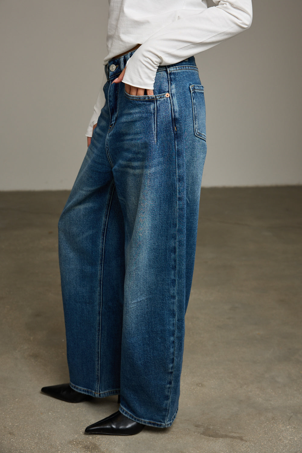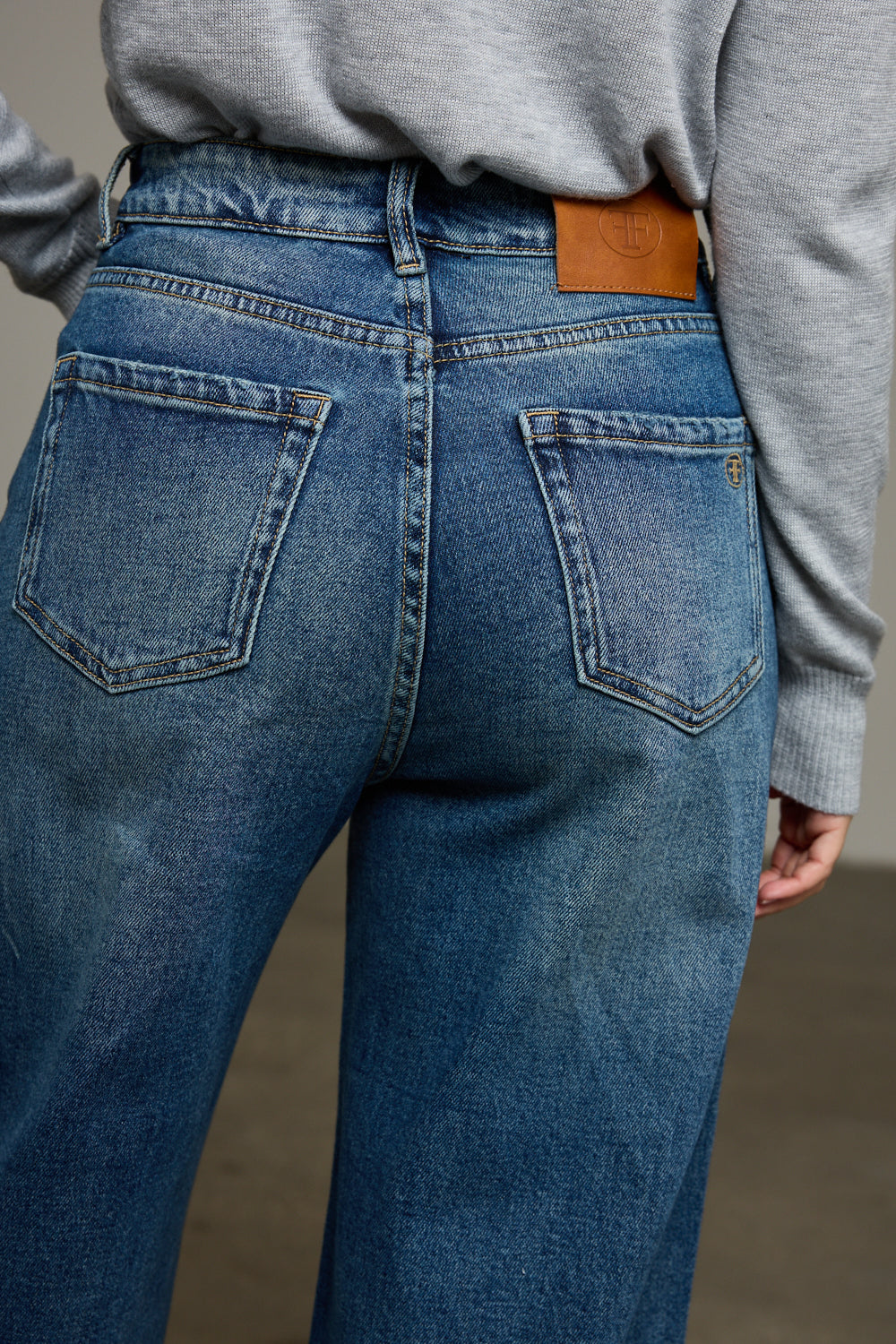 מכנסי ג'ינס בגזרה קרובה לגוף מבד לייקרה בשילוב לולאות חגורה כפולות, חמישה כיסים שטיפה עדינה, תפרים עיצוביים וסגירת כפתור עם רוכסן מלפנים