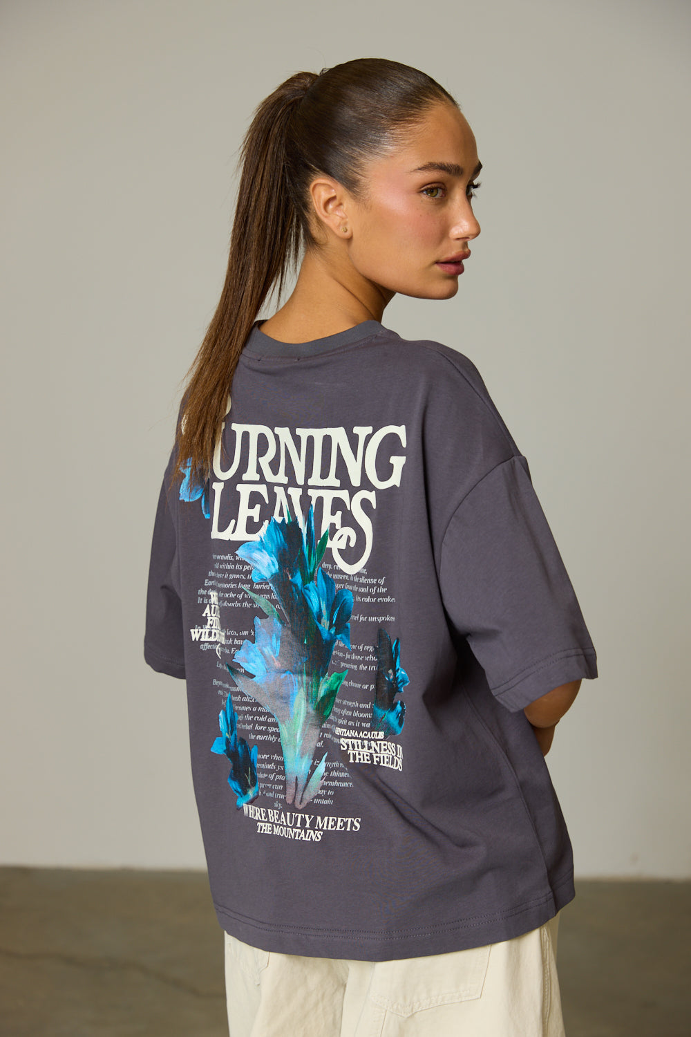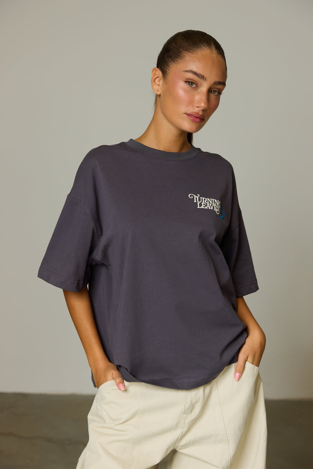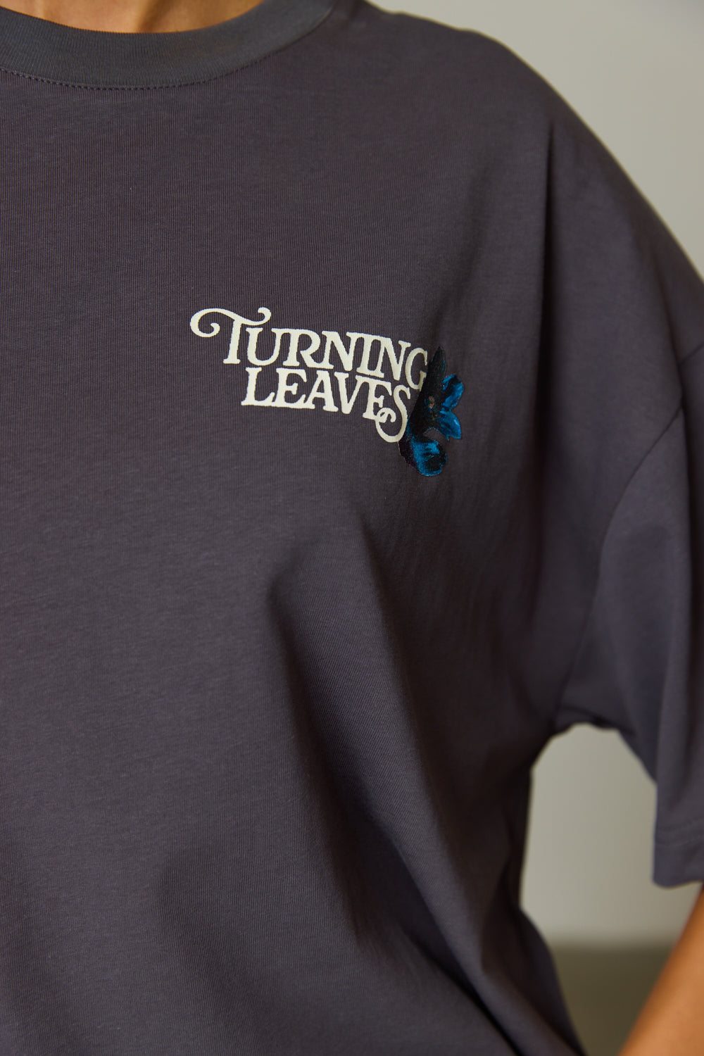 טי שירט בגזרה משוחררת מבד נעים למגע בשילוב הדפס מלפנים ומאחור. לחולצה שרוולים באורך בינוני