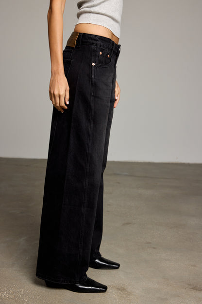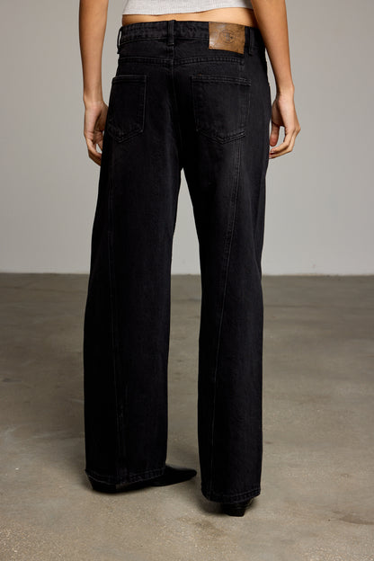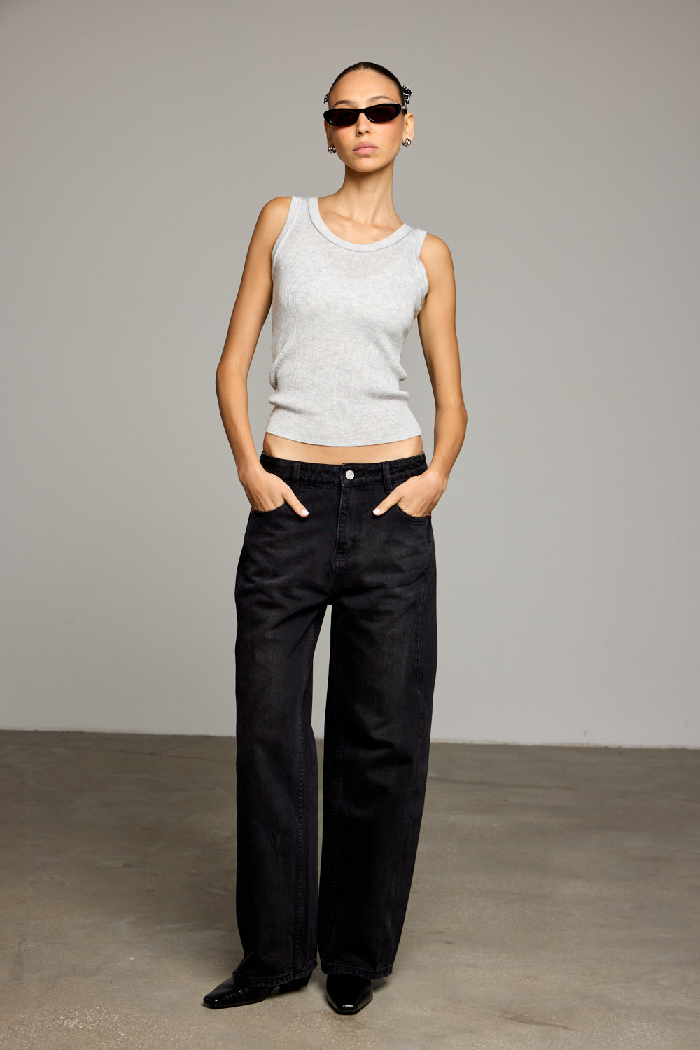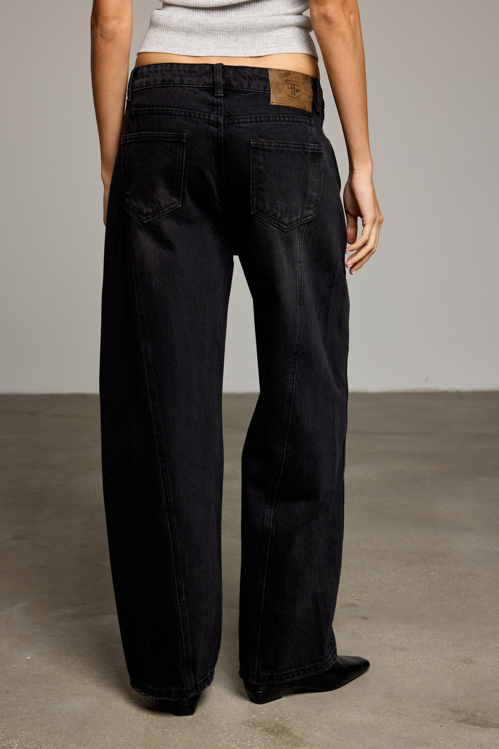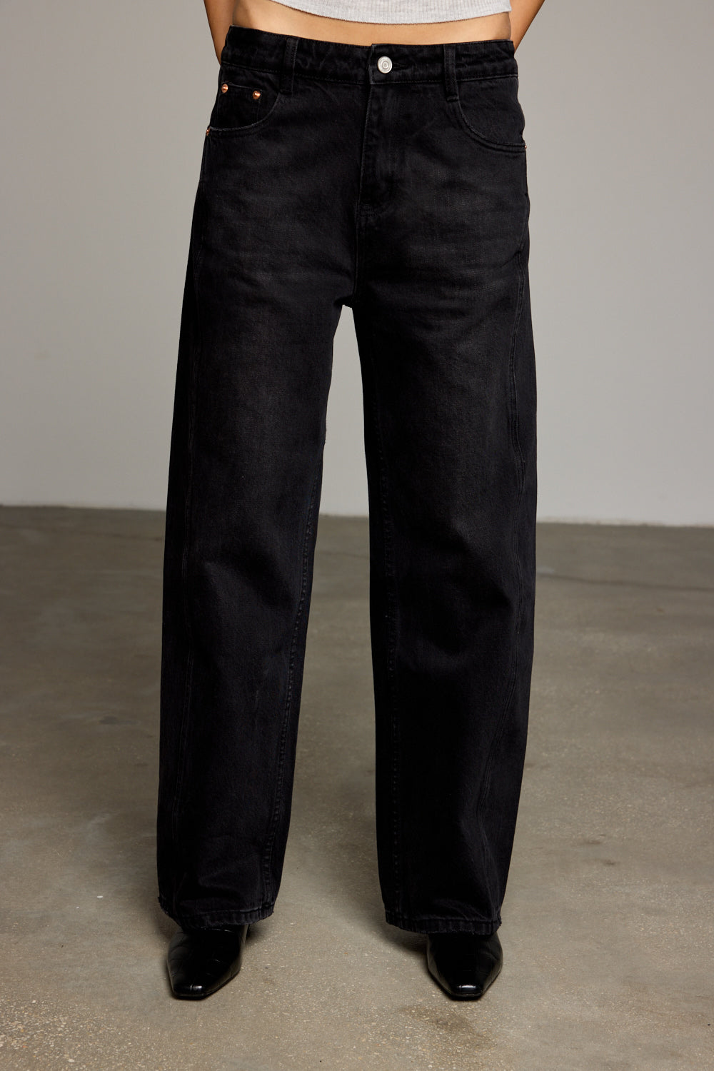 ג'ינס בגזרת בויפרנד בשילוב לולאות לחגורה, חמישה כיסים, תפרים עיצוביים וסגירת כפתור עם רוכסן מלפנים