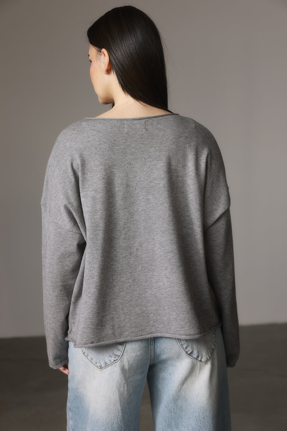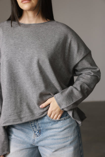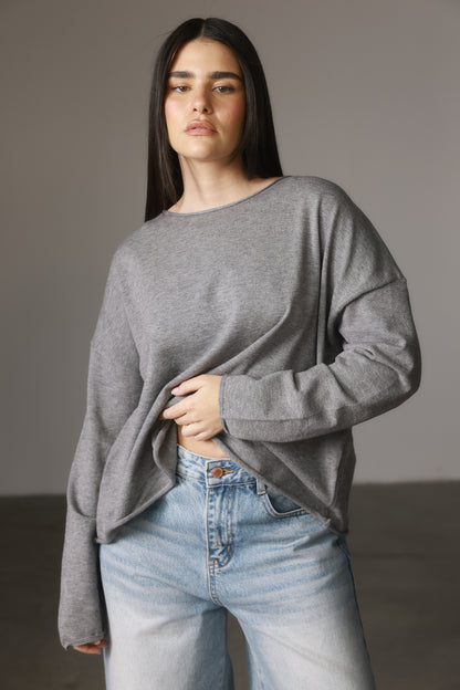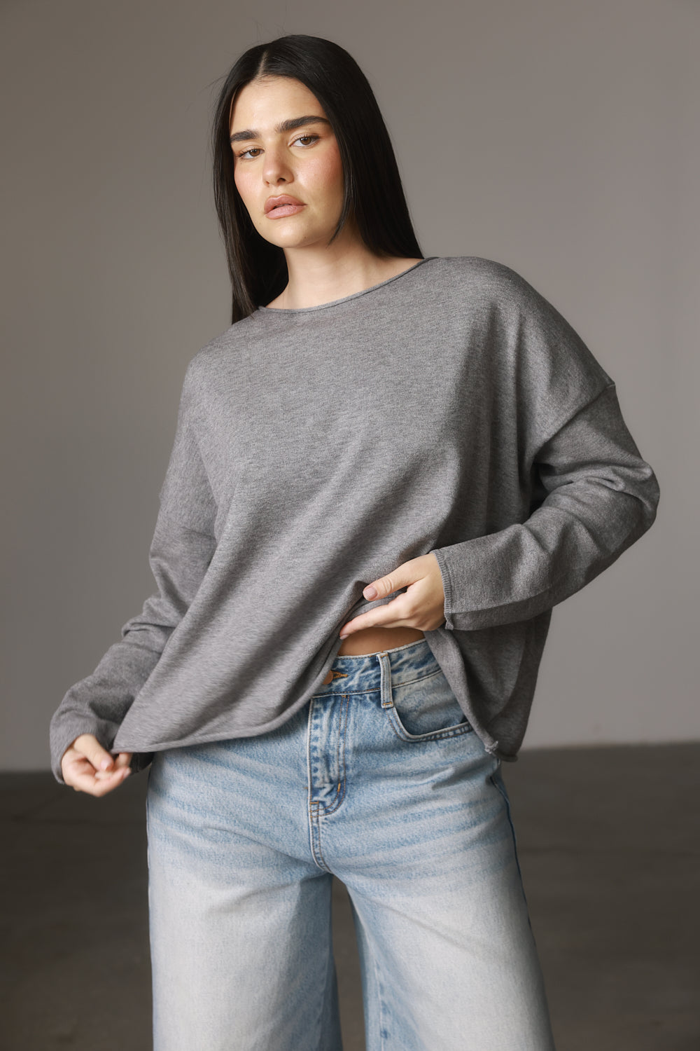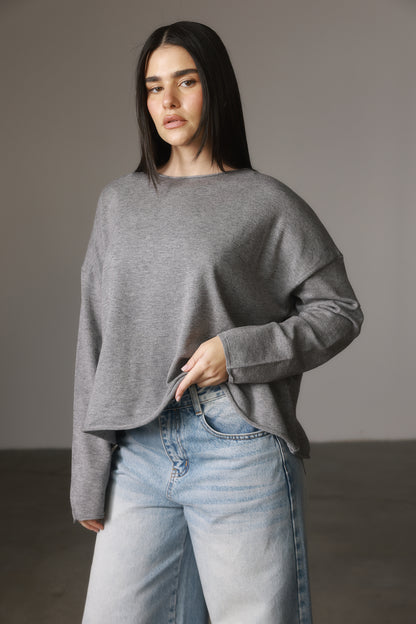 חולצת סריג בגזרת אוברסייז מבד נעים ורך למגע בשילוב מפתח צוואר סירה ושרוולים ארוכים. לחולצה סיומת גזורה