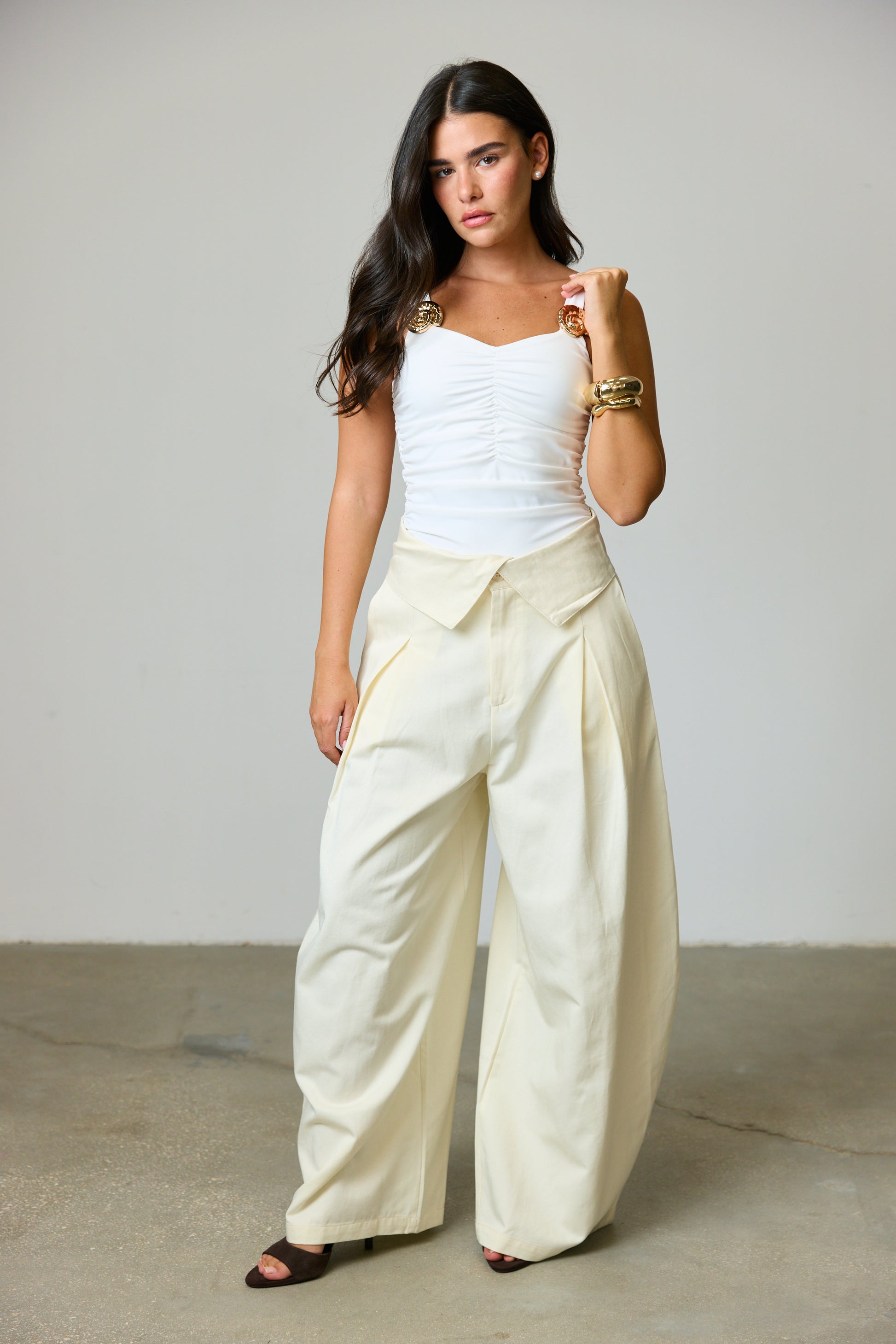 מכנסיים בגזרת אוברסייז בשילוב מותן מעטפת, קפלים מלפנים, סגירת כפתור עם רוכסן