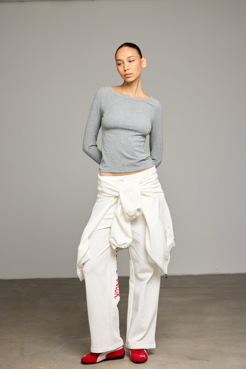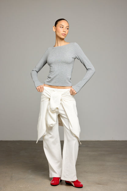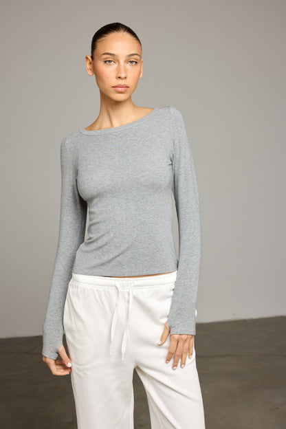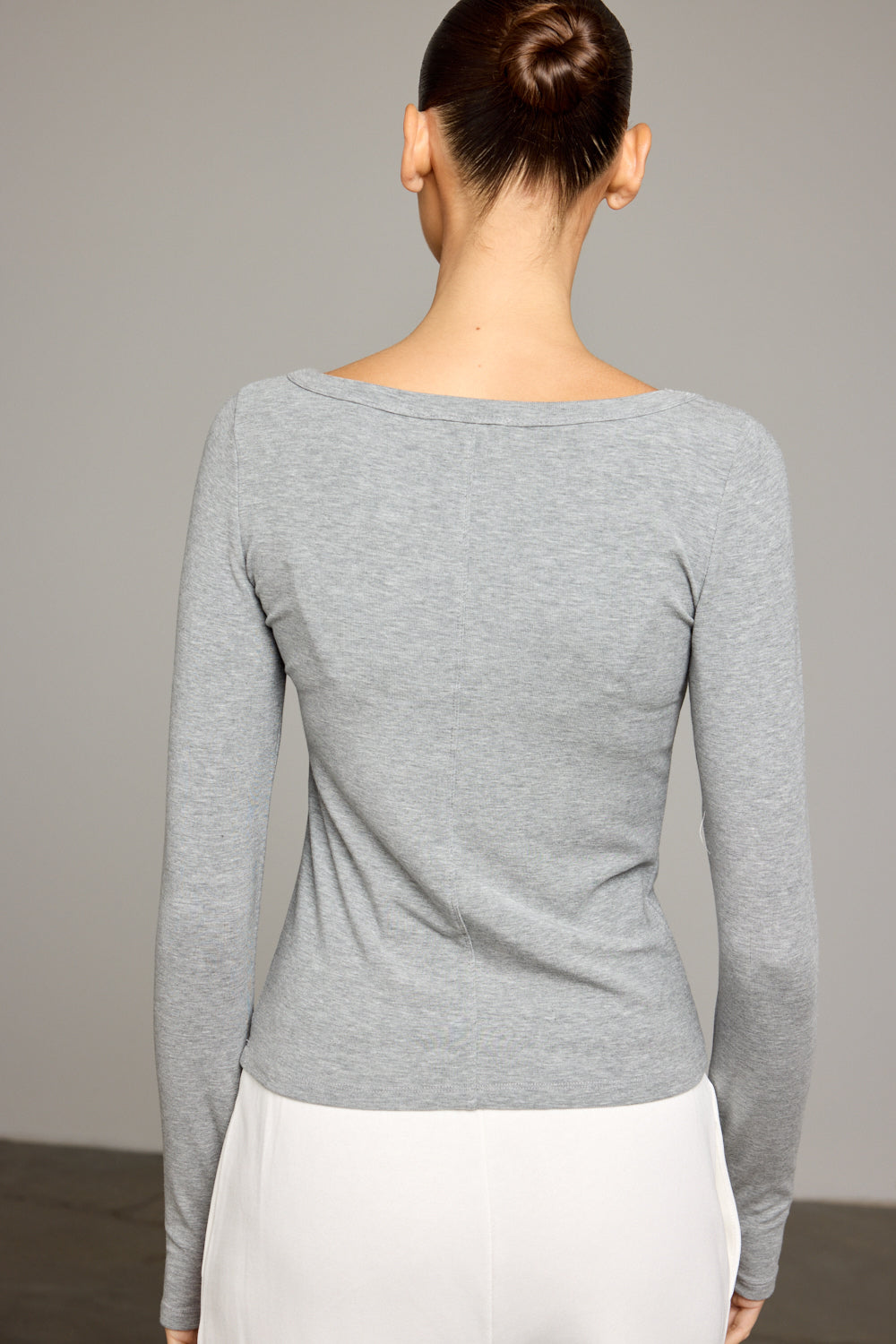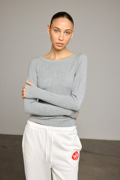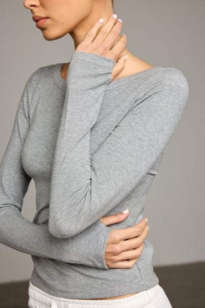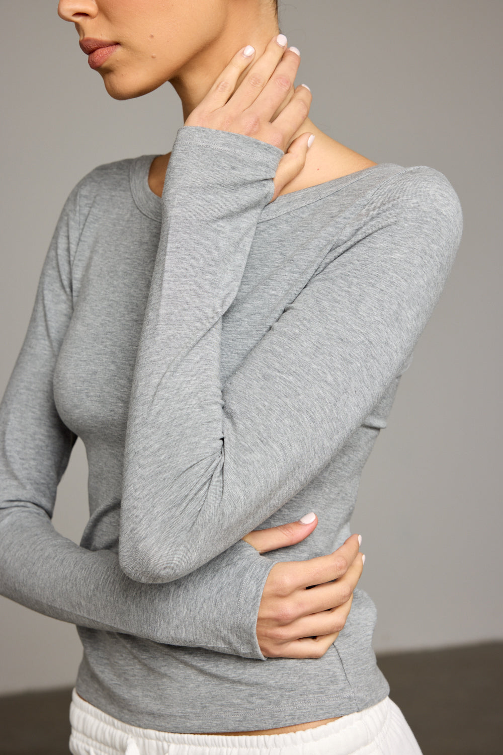 חולצה בגזרה צמודה לגוף מבד לייקרה נעים למגע בשילוב מפתח צוואר סירה בשילוב שרוולים ארוכים עם פתח לאגודל