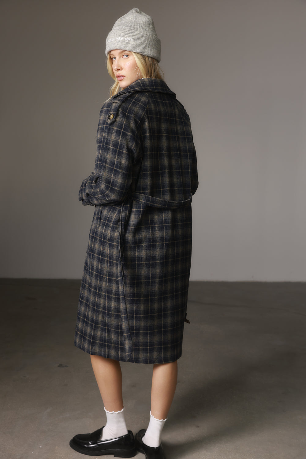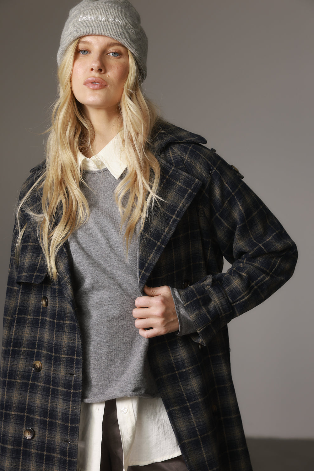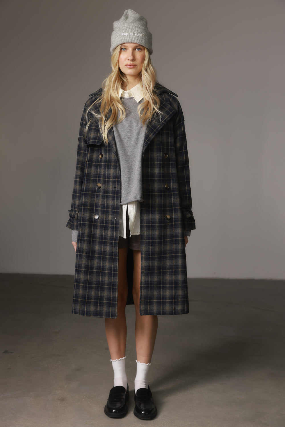 מעיל בלשים ארוך מבד צמר בשילוב פרינט משבצות, צווארון קובני, כפתורים מלפנים, צמד כיסים ושרוך קשירה להידוק