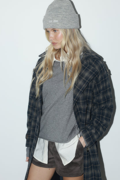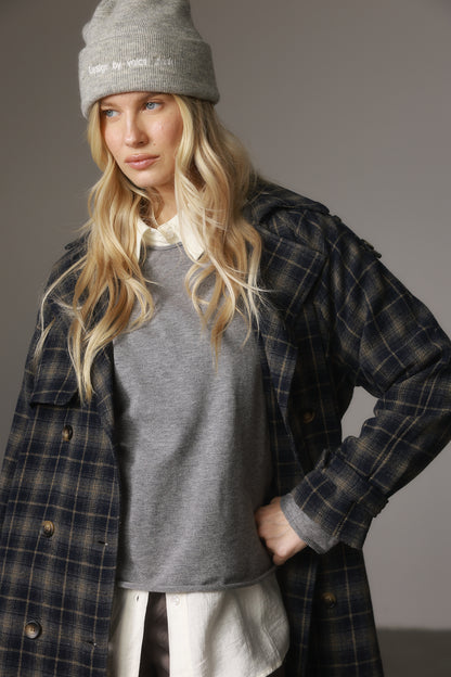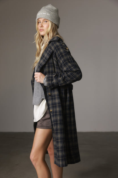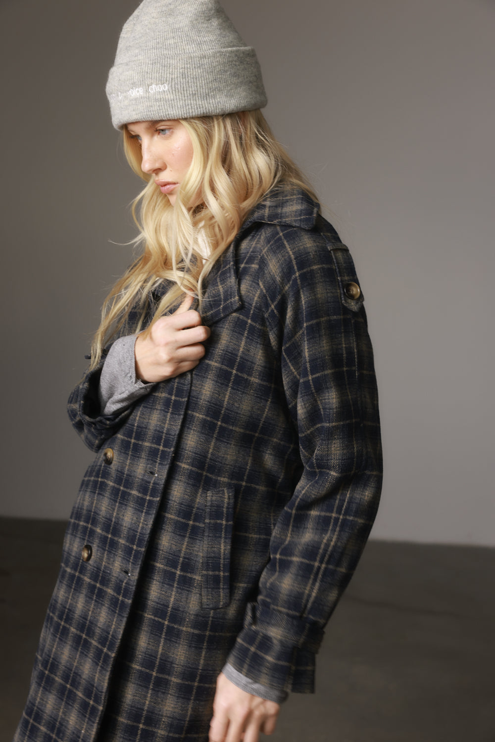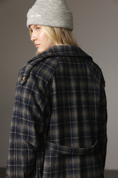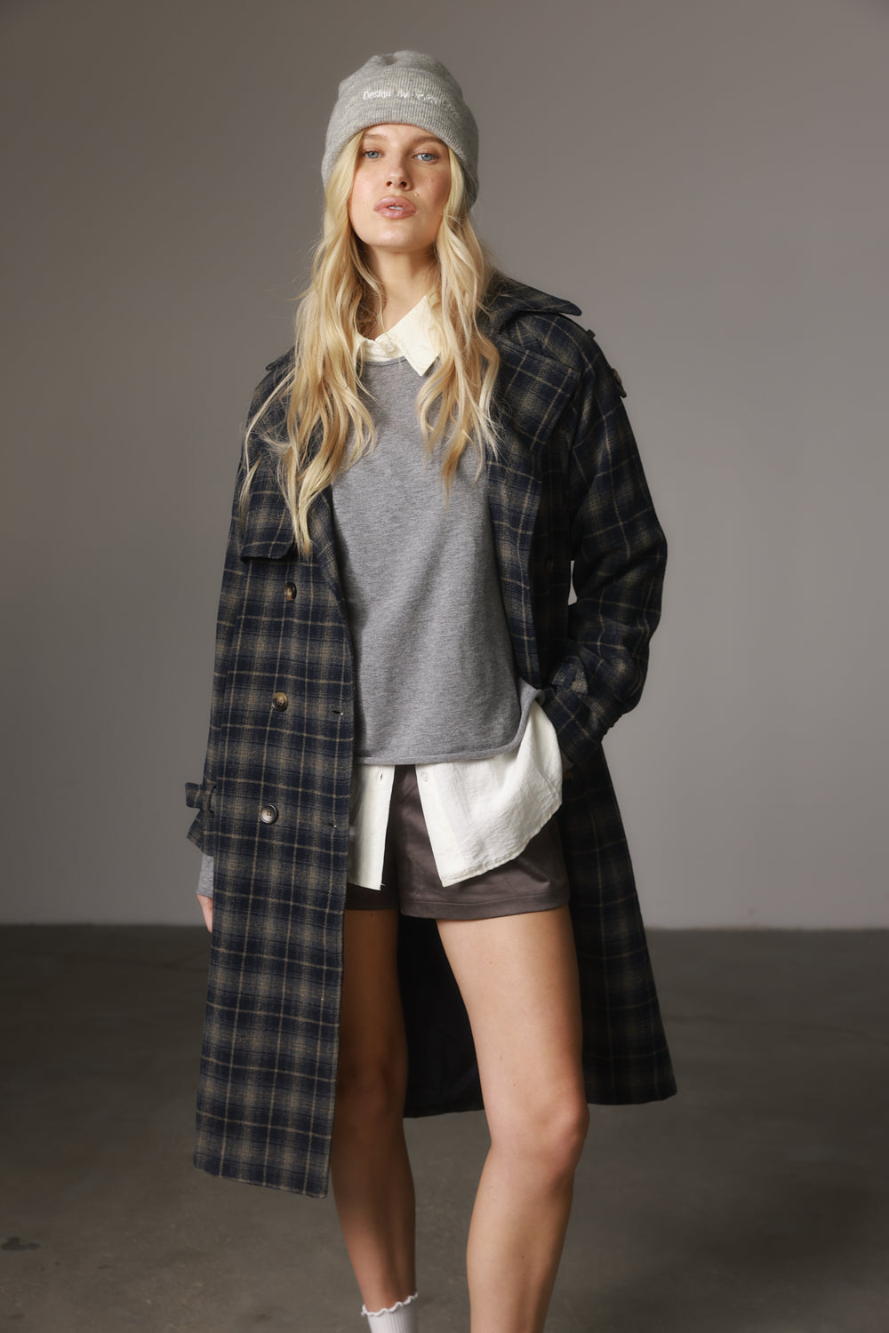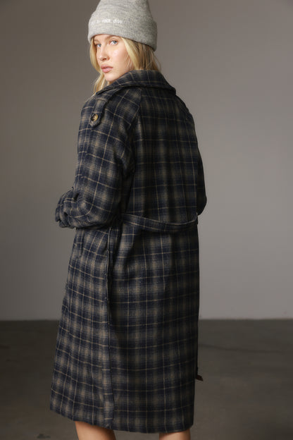 מעיל בלשים ארוך מבד צמר בשילוב פרינט משבצות, צווארון קובני, כפתורים מלפנים, צמד כיסים ושרוך קשירה להידוק