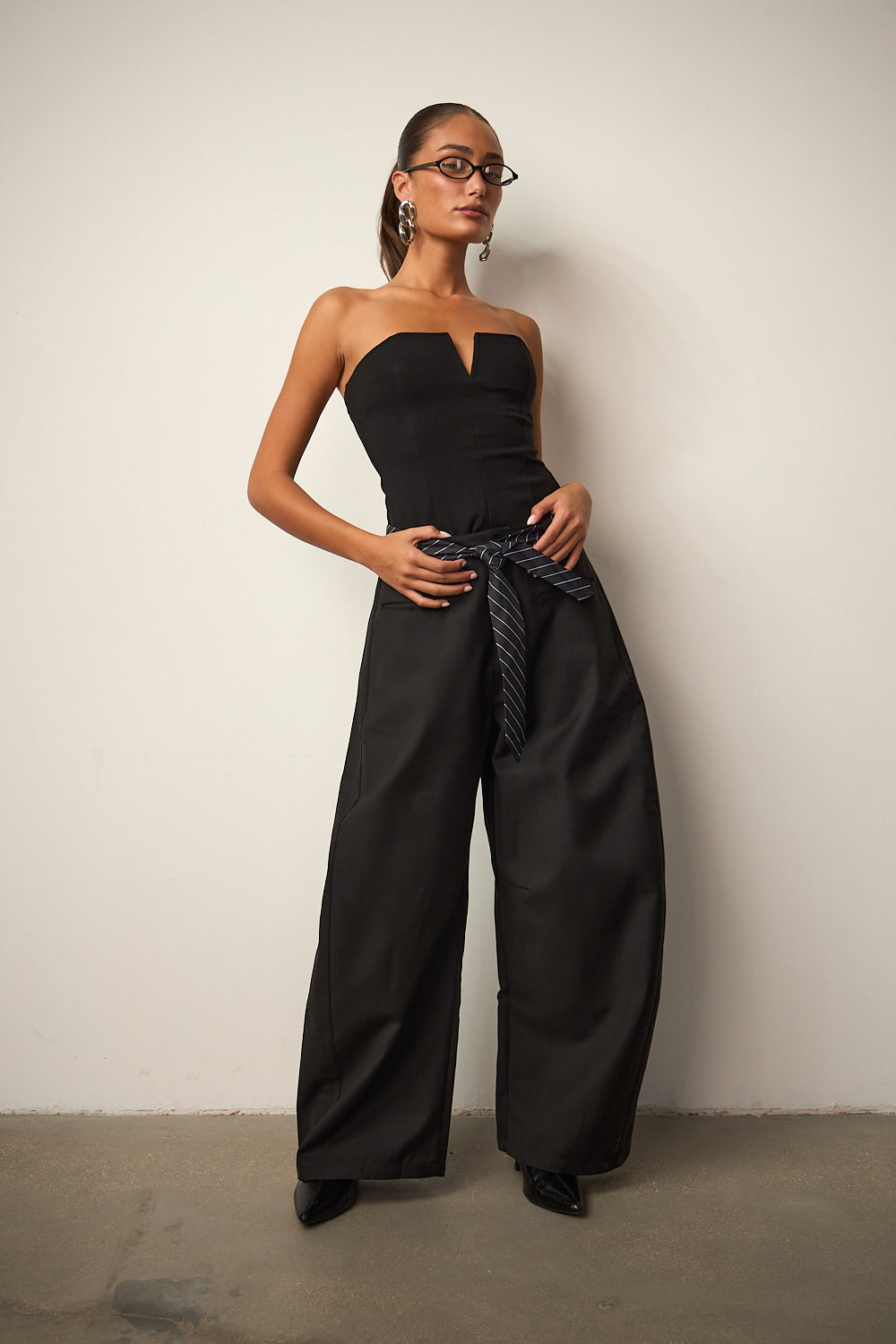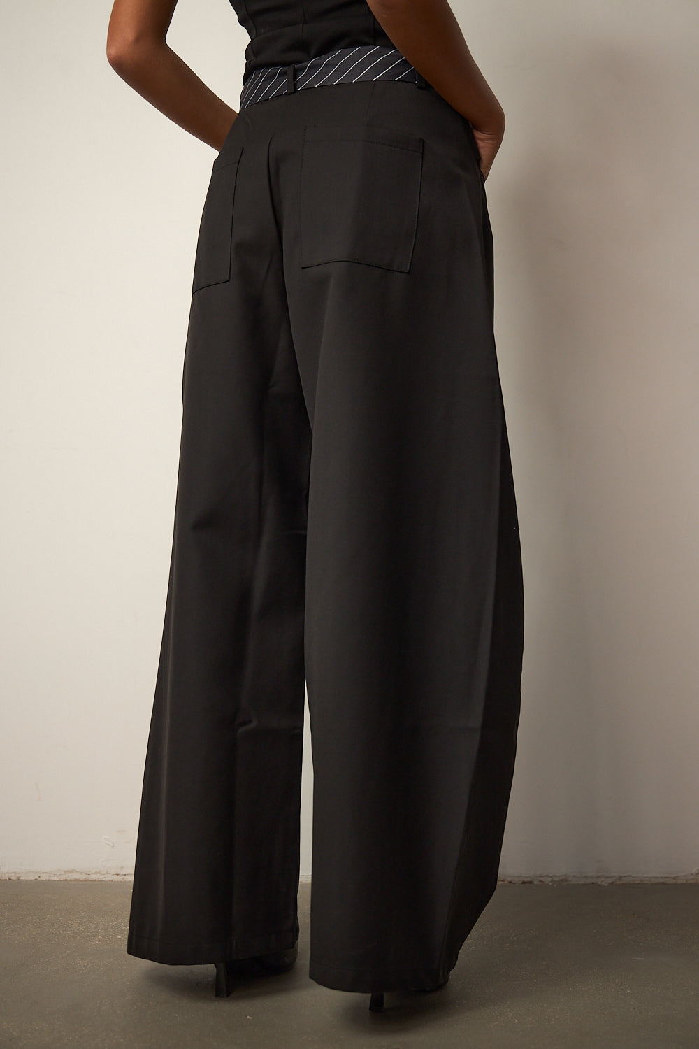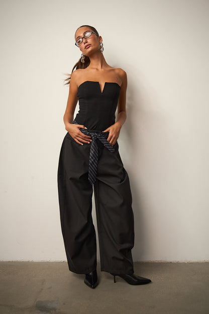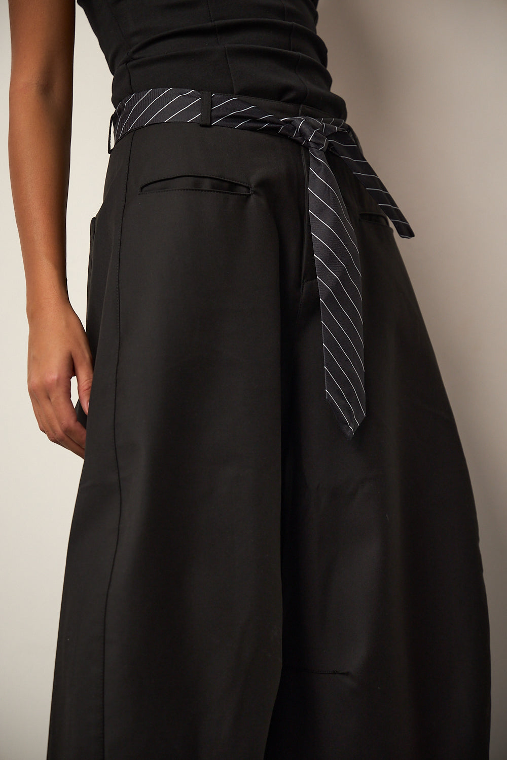מכנסיים בגזרת בלון מבד אריג חלק בשילוב צמד כיסי דמה בחזית, לולאות לחגורה, עניבה, וצמד כיסים מרובעים מאחור