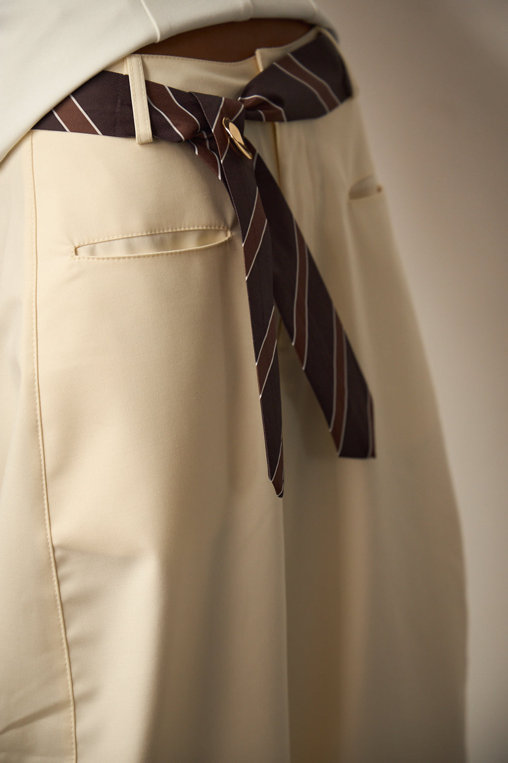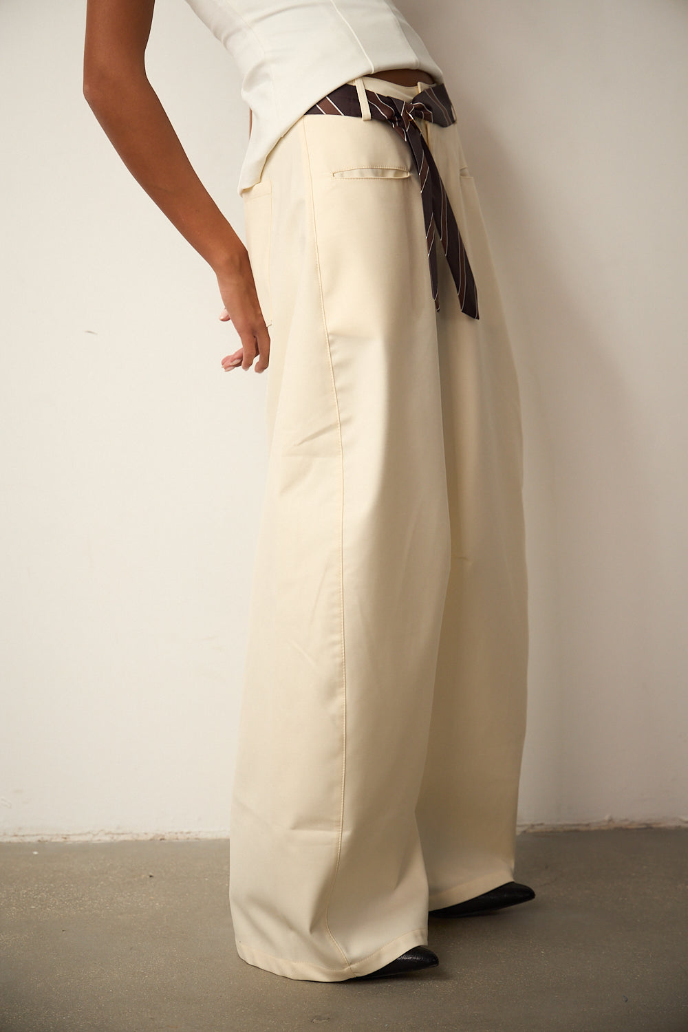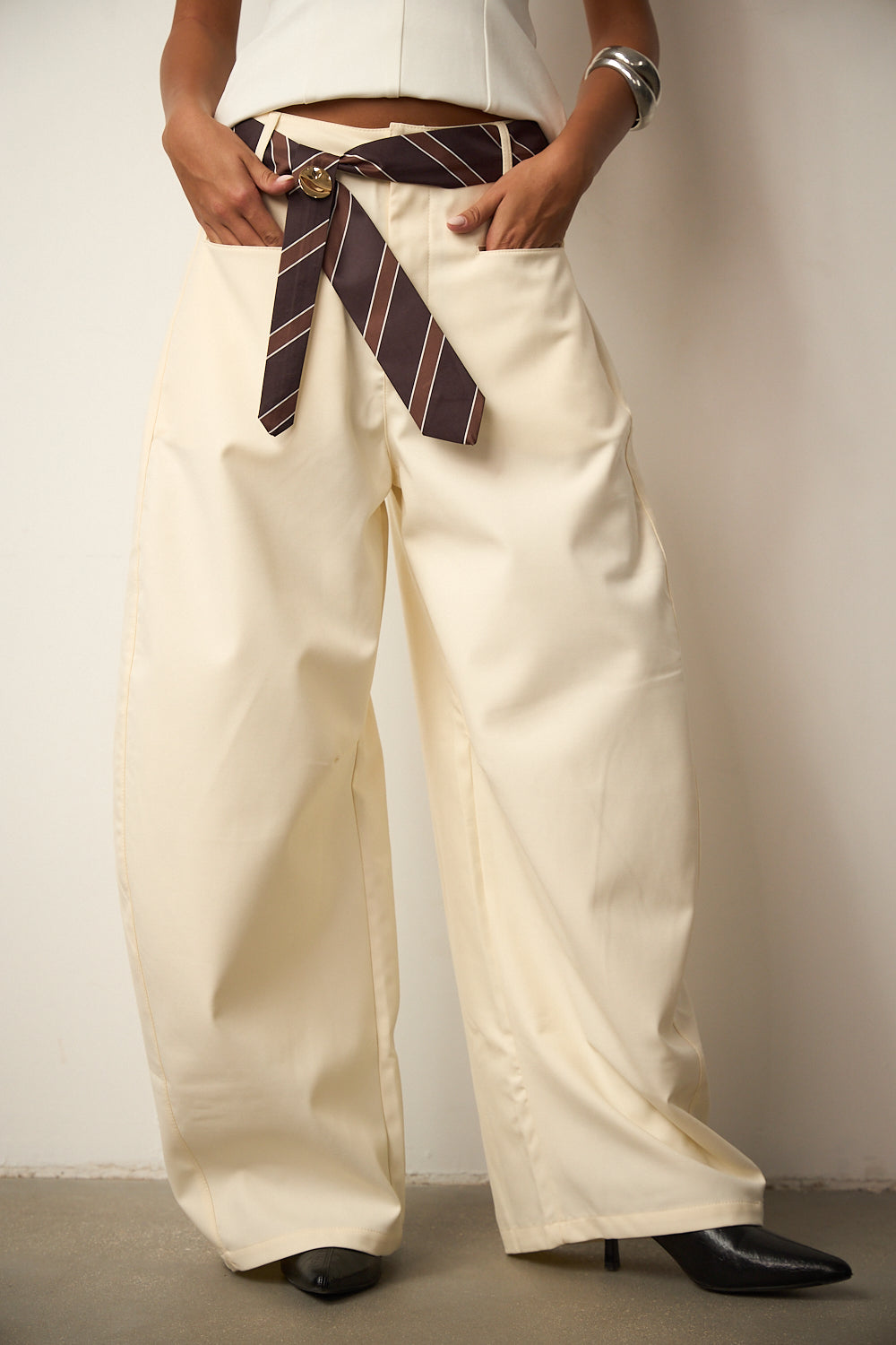 מכנסיים בגזרת בלון מבד אריג חלק בשילוב צמד כיסי דמה בחזית, לולאות לחגורה, עניבה, וצמד כיסים מרובעים מאחור