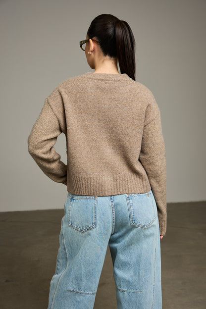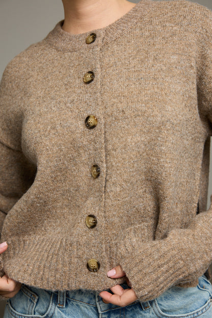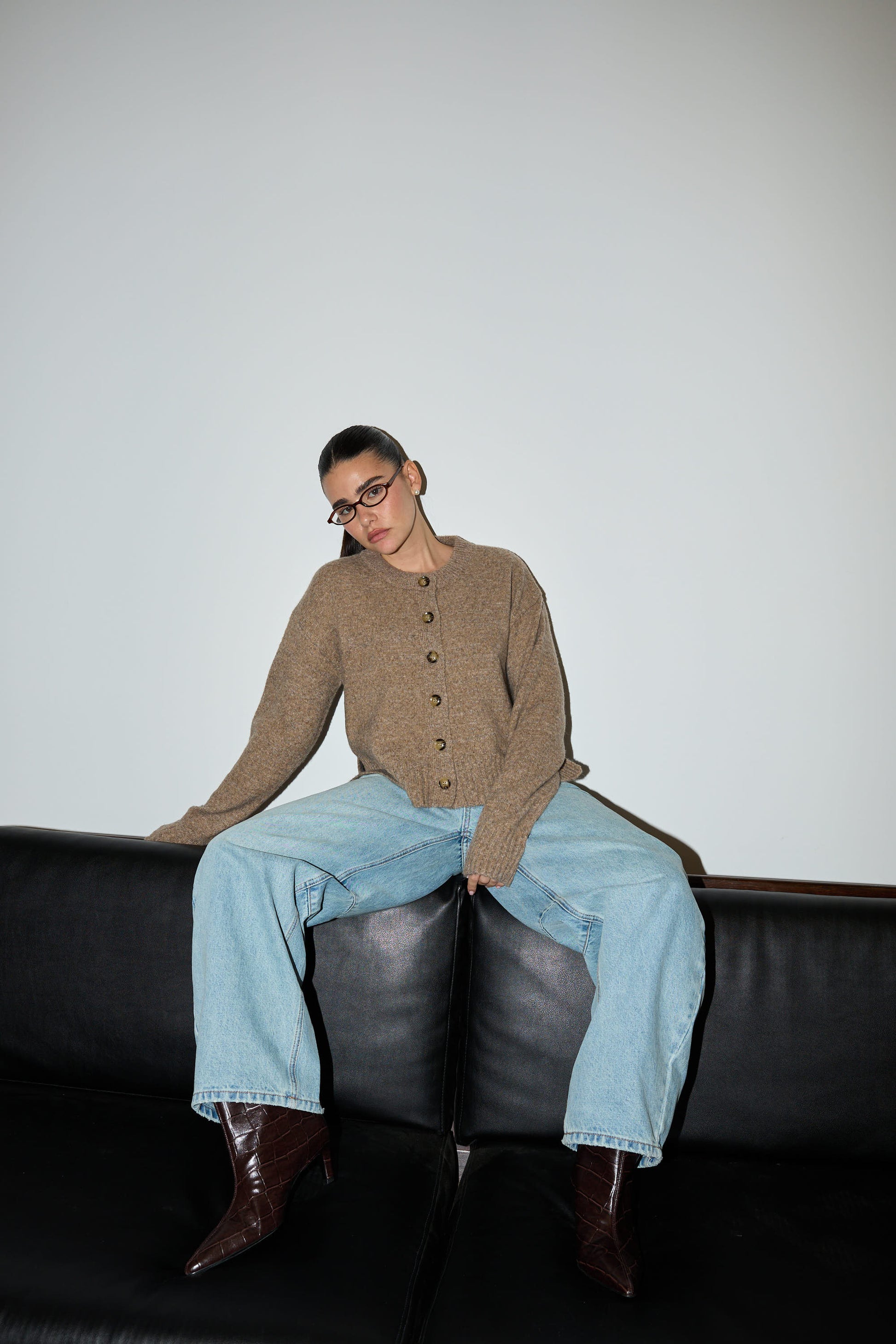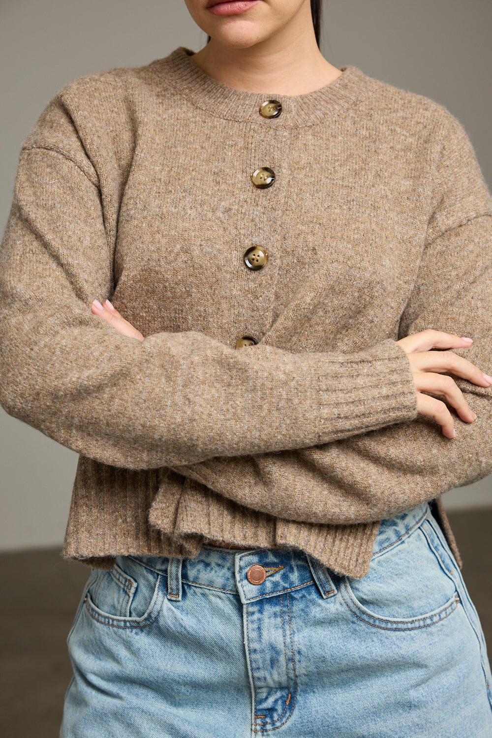 קרדיגן בגזרה קרובה לגוף מבד סריג נעים למגע בשילוב צווארון מעוגל, כפתורים מלפנים ושרוולים ארוכים