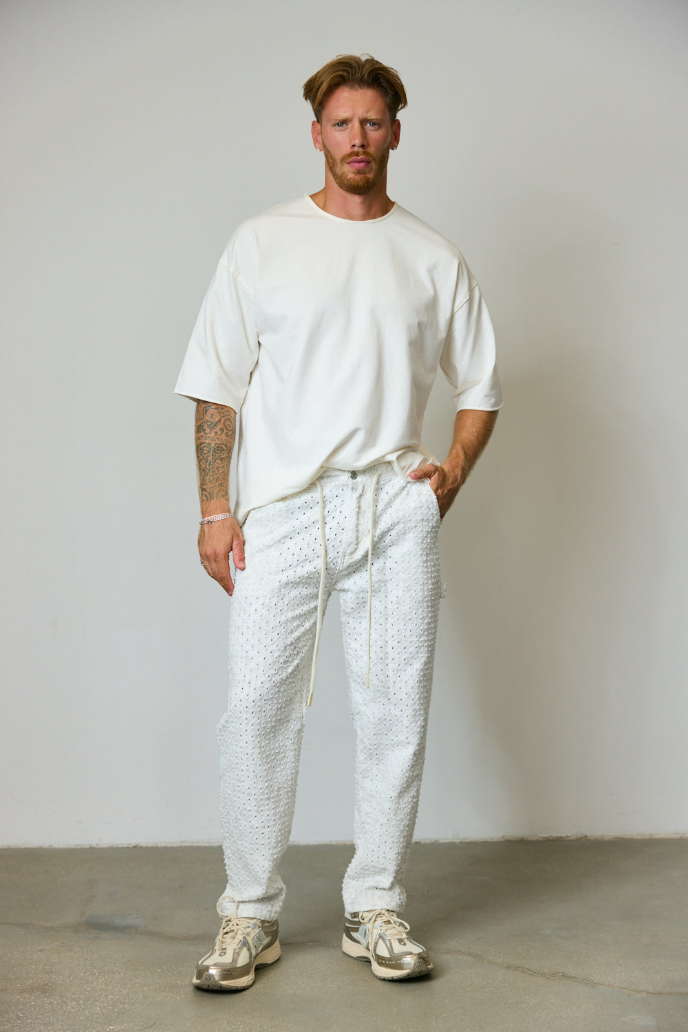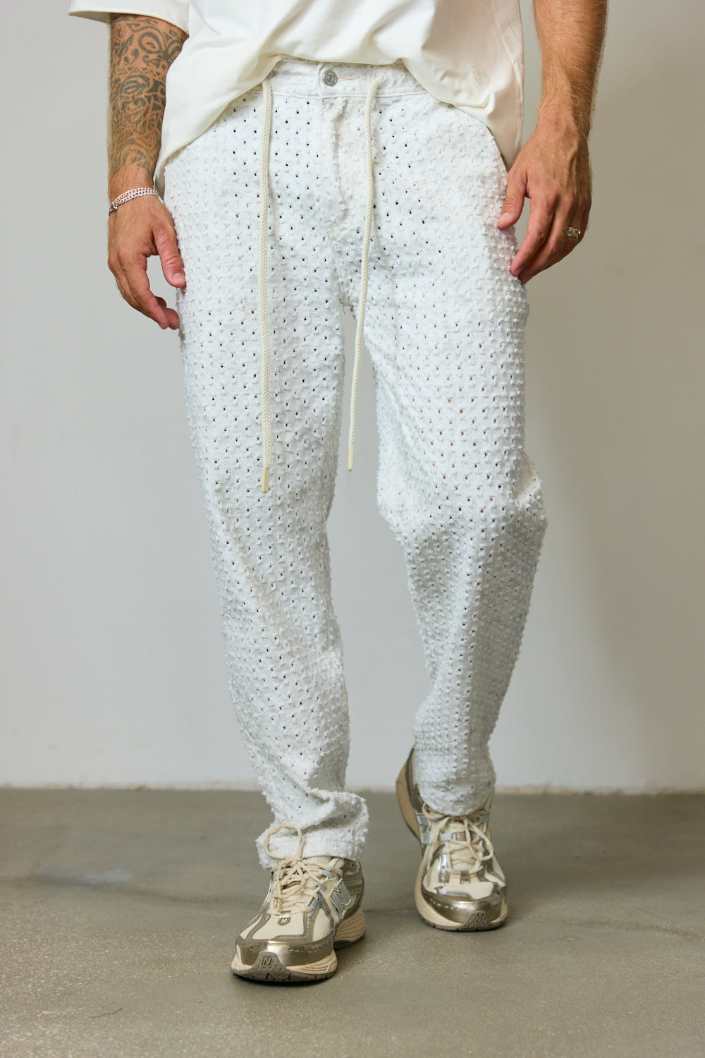 מכנסי ג'ינס בגזרה משוחררת בשילוב טקסטורה מחוררת, מותן אלסטית, שרוך קשירה להידוק, לולאות לחגורה וארבעה כיסים