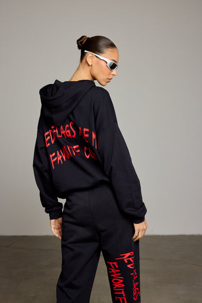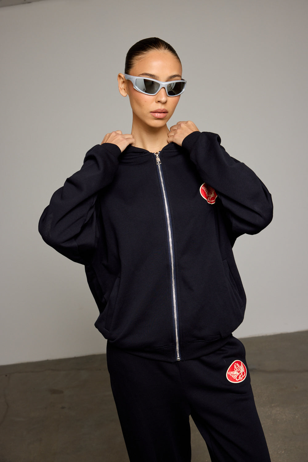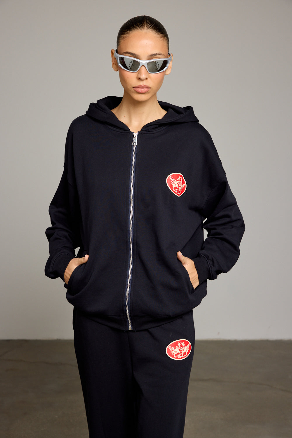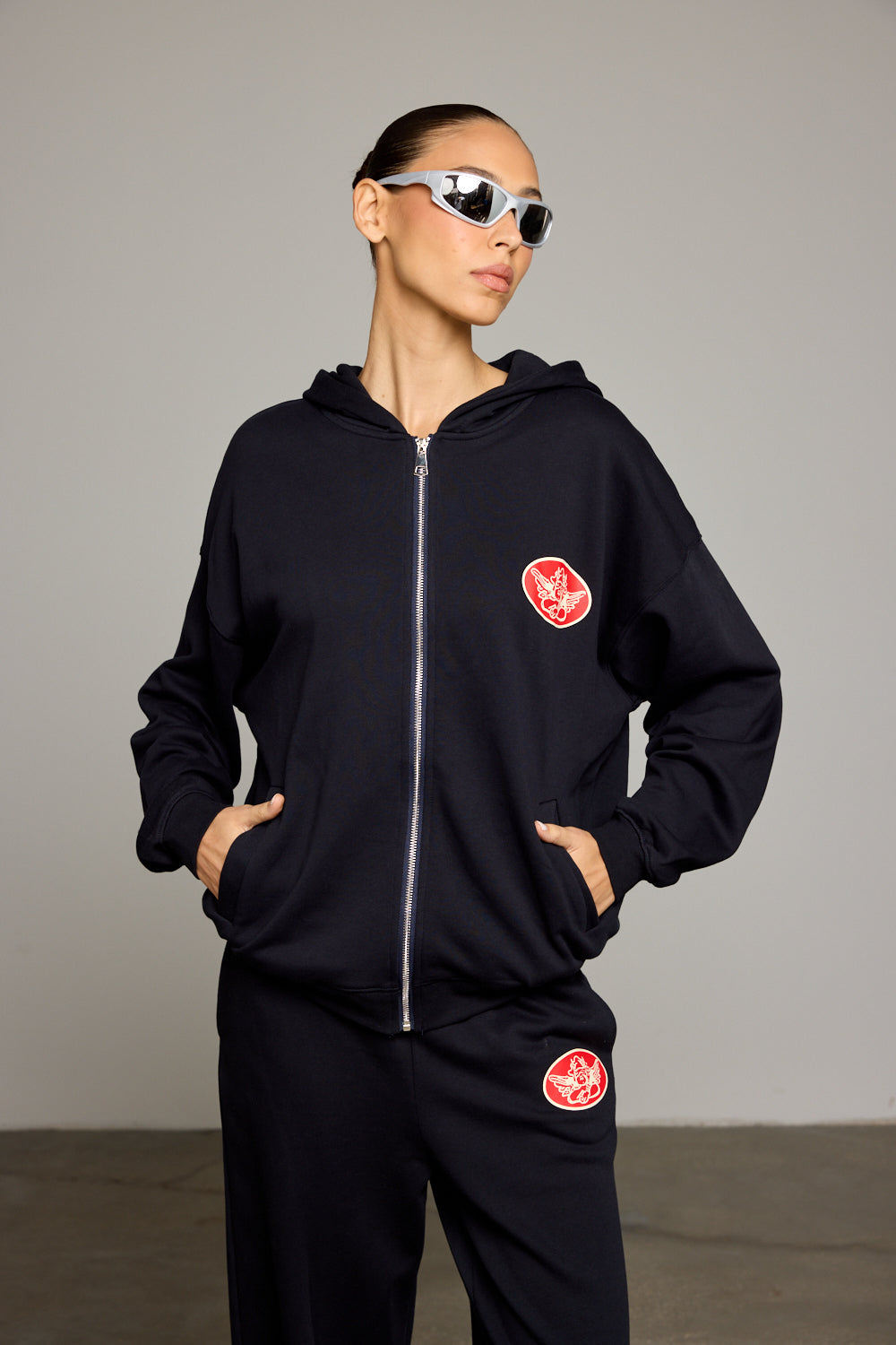סווטשירט בגזרה משוחררת מבד נעים למגע בשילוב קפוצ'ון, סגירת רוכסן מלפנים, צמד כיסים והדפס קדמי ואחורי. שלבי עם מכנסי טקסס ליצירת לוק סטריט משגע!