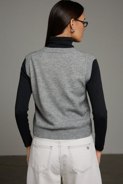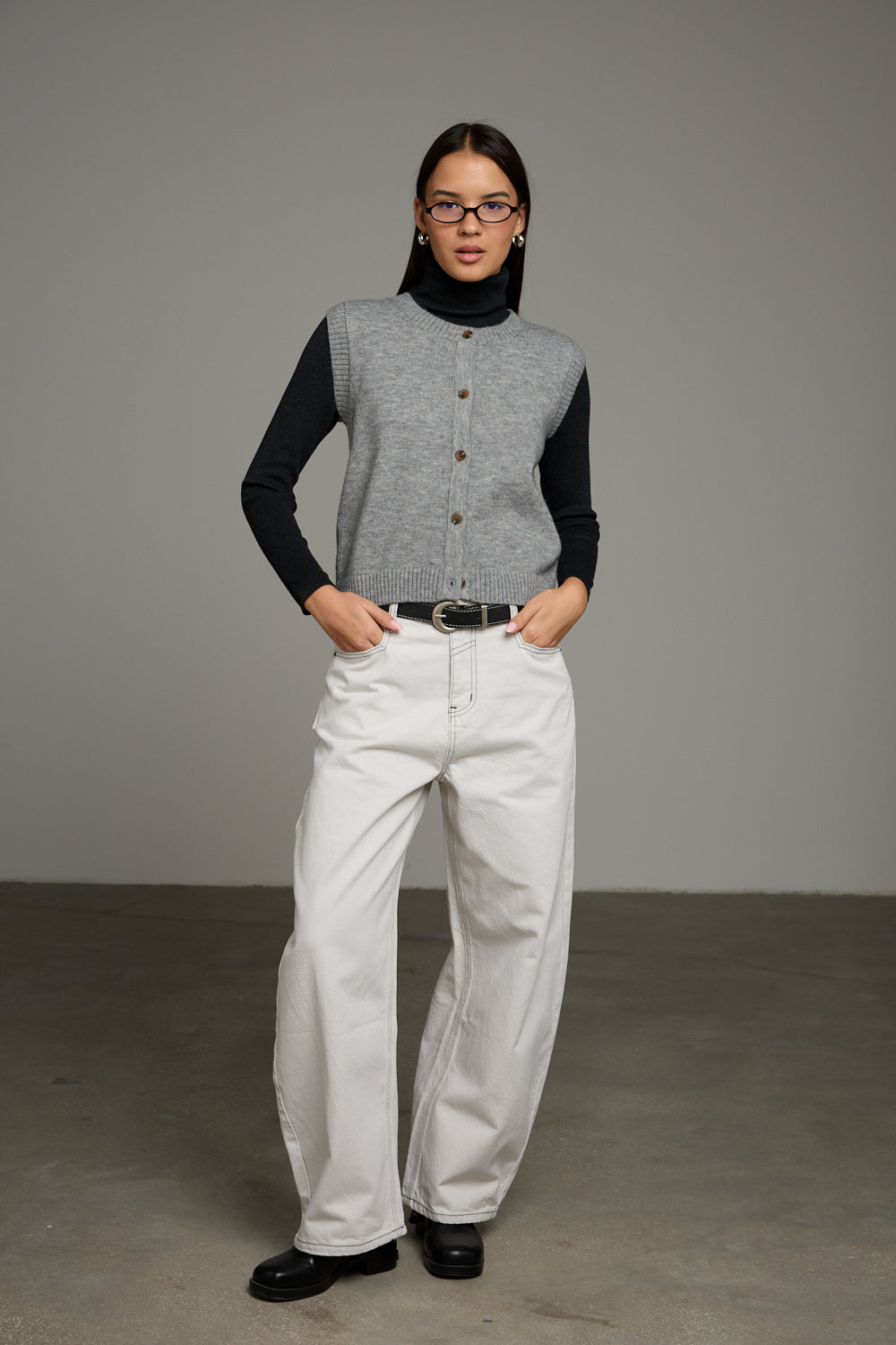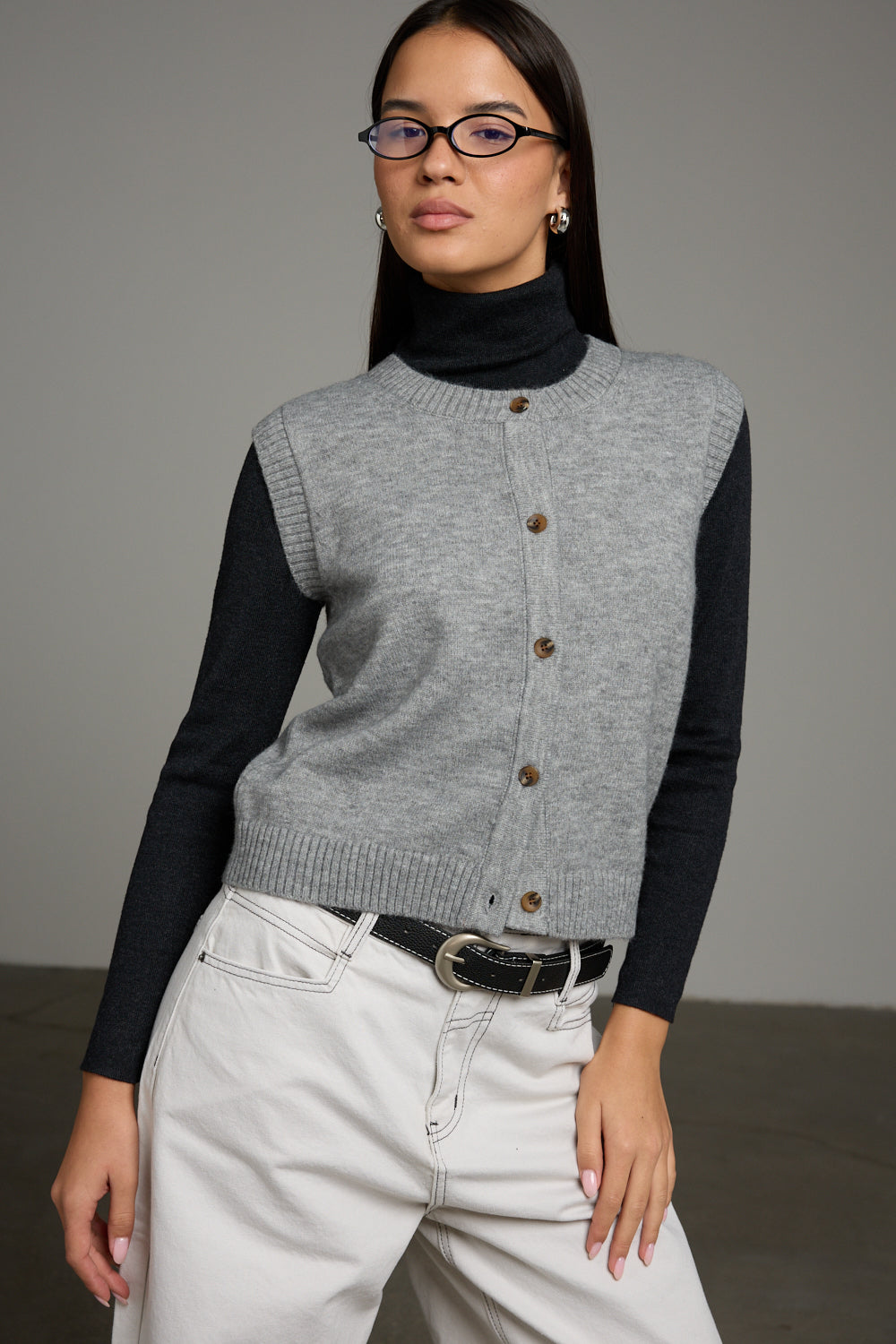 וסט סריג בגזרה רחבה בשילוב צווארון מעוגל, כפתורי סגירה בחזית וכתפיות רחבות